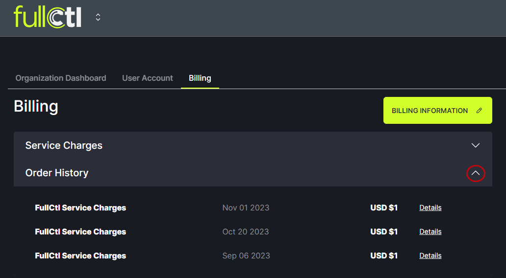 Order History Your past payments can be viewed by expanding Order History. Clicking on details will bring up a page with an option to download a receipt. Previous Next