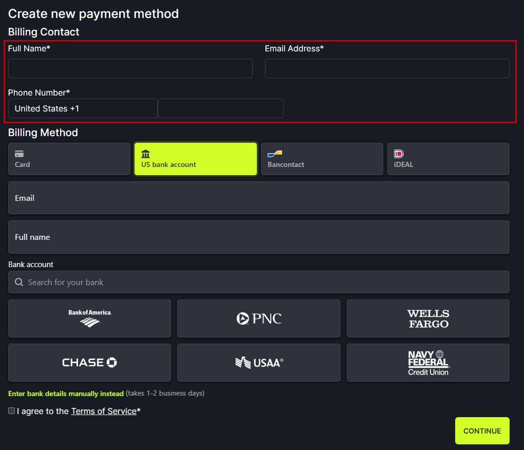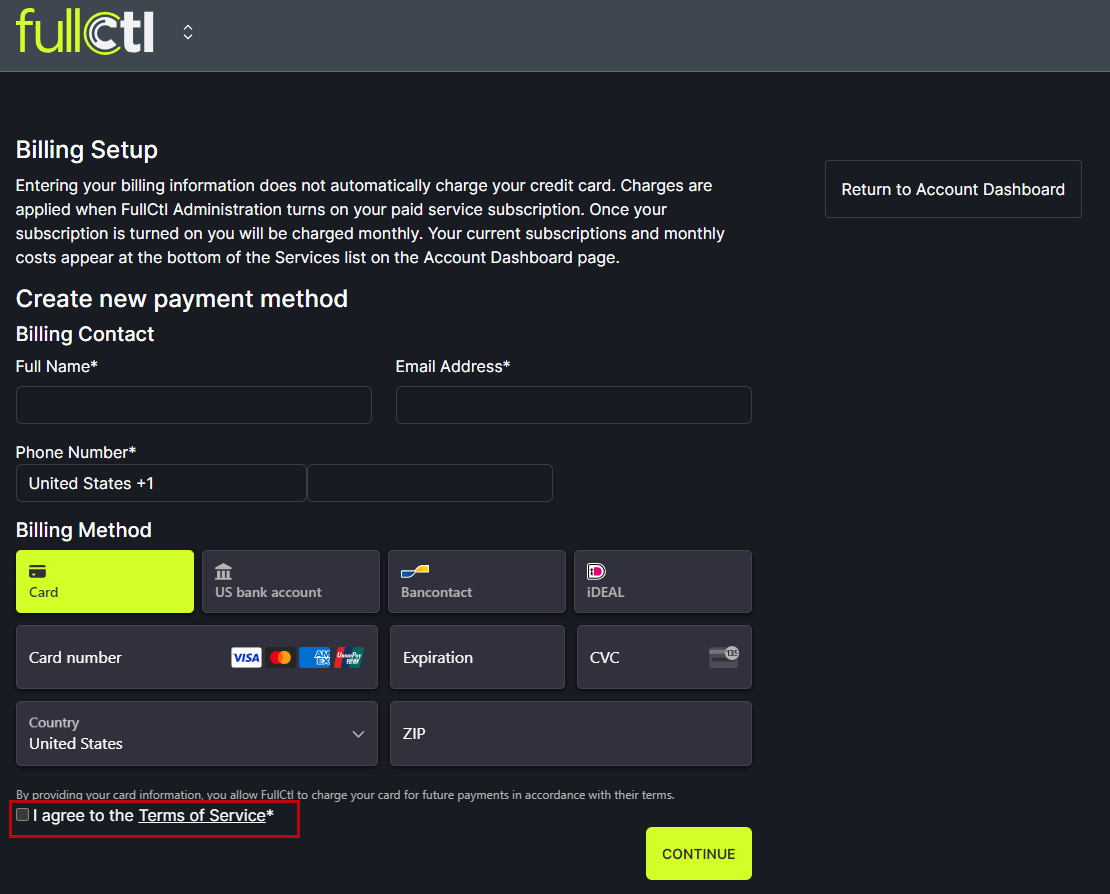 IMPORTANT: When all steps are complete on the bank website, return to the FullCtl website. You must read the Terms of Service, check the box, and click Continue to finalize the setup process.