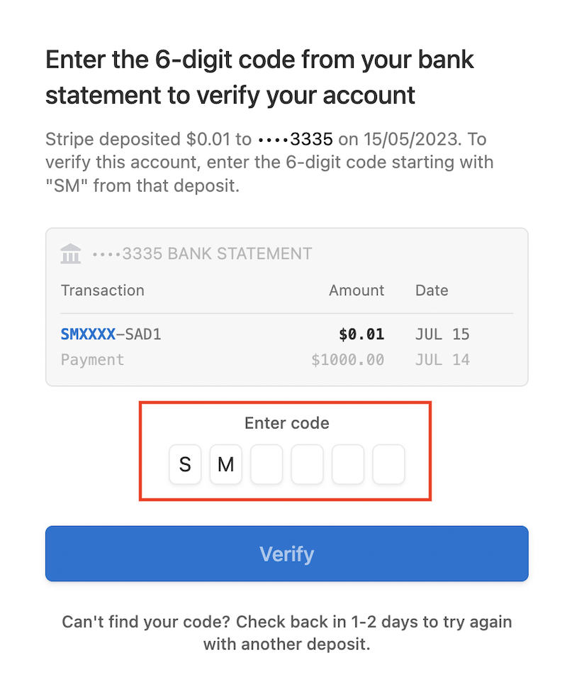 In 1-2 business days, you will receive an email from Stripe asking you to check your bank account for a deposit. Click the link in the email to Verify deposit.