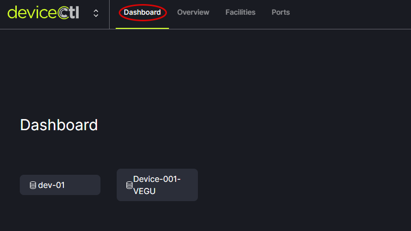 Dashboard Clicking on the Dashboard tab in the header menu provides a list of all active Devices. Click on a Device to view details. Previous Next