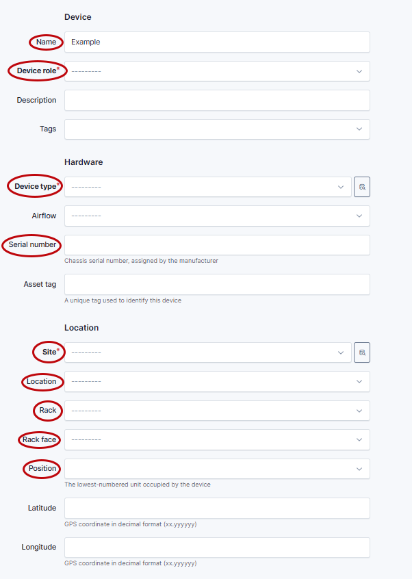 Fill out the following fields: Device: Name, Device role Hardware: Device type, Serial number Location: Site, Location, Rack, Rack face, Positon