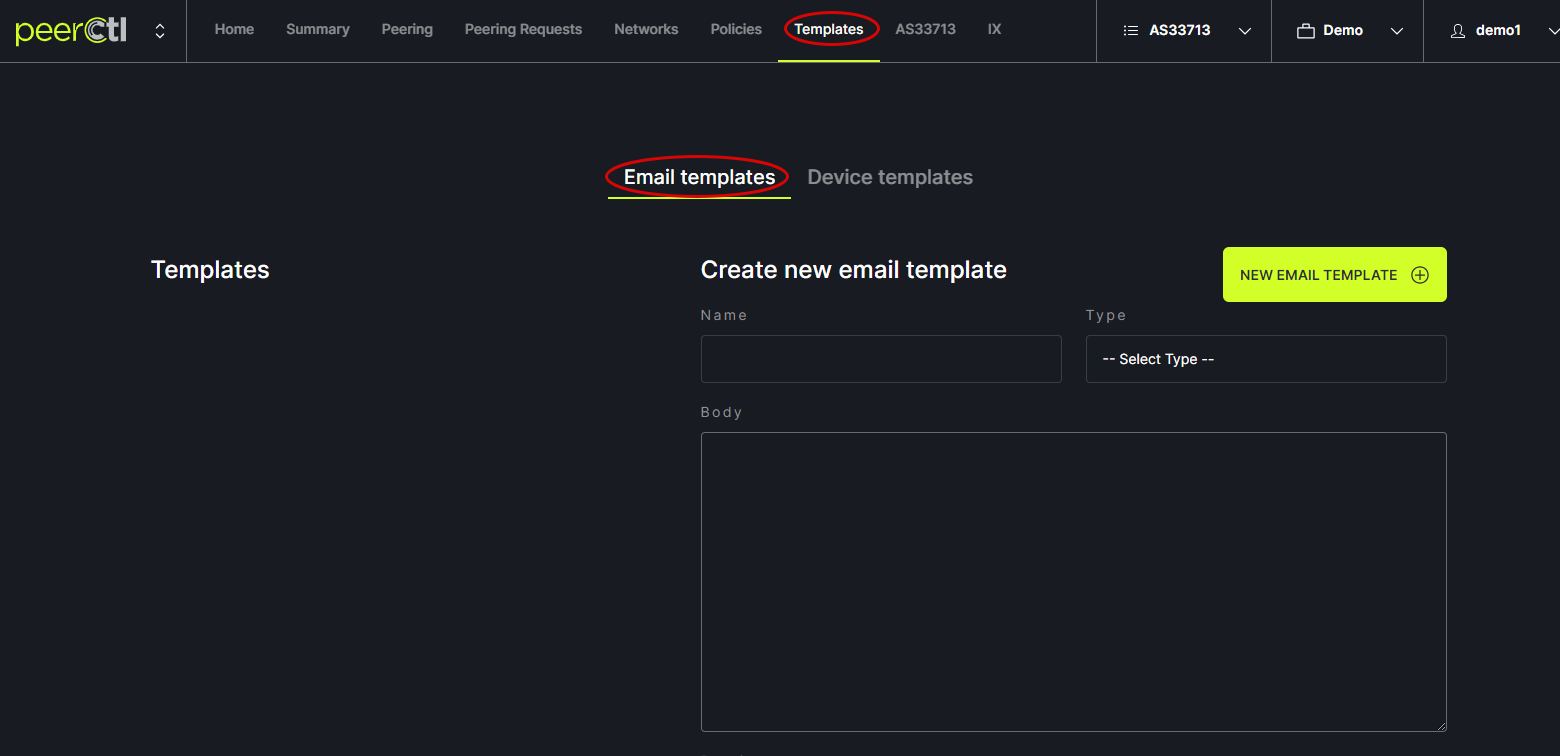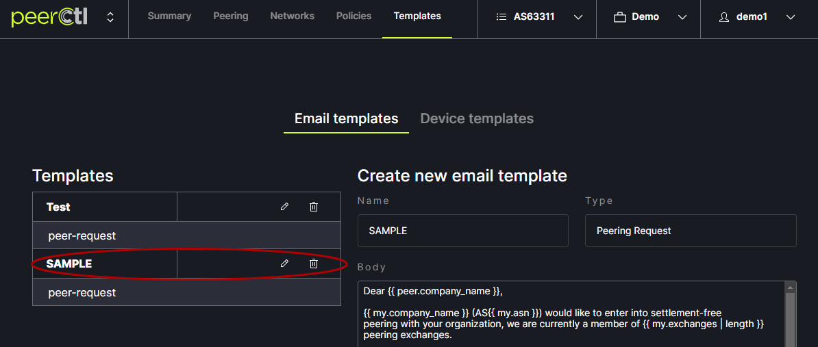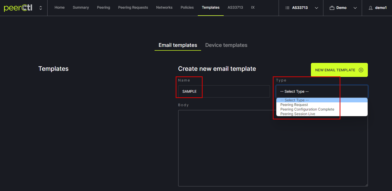 Enter a name for the custom Template. Choose the Type of Template to be customized. Each type of template is based on one of the three steps in the Request Peering process.