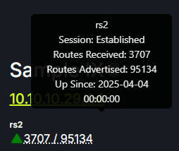 Hovering over the route servers will display the number of routes received, advertised and length of time the connection has been established.