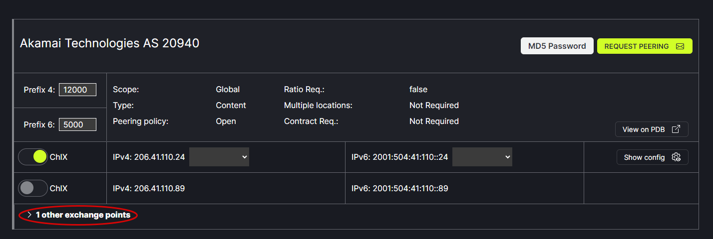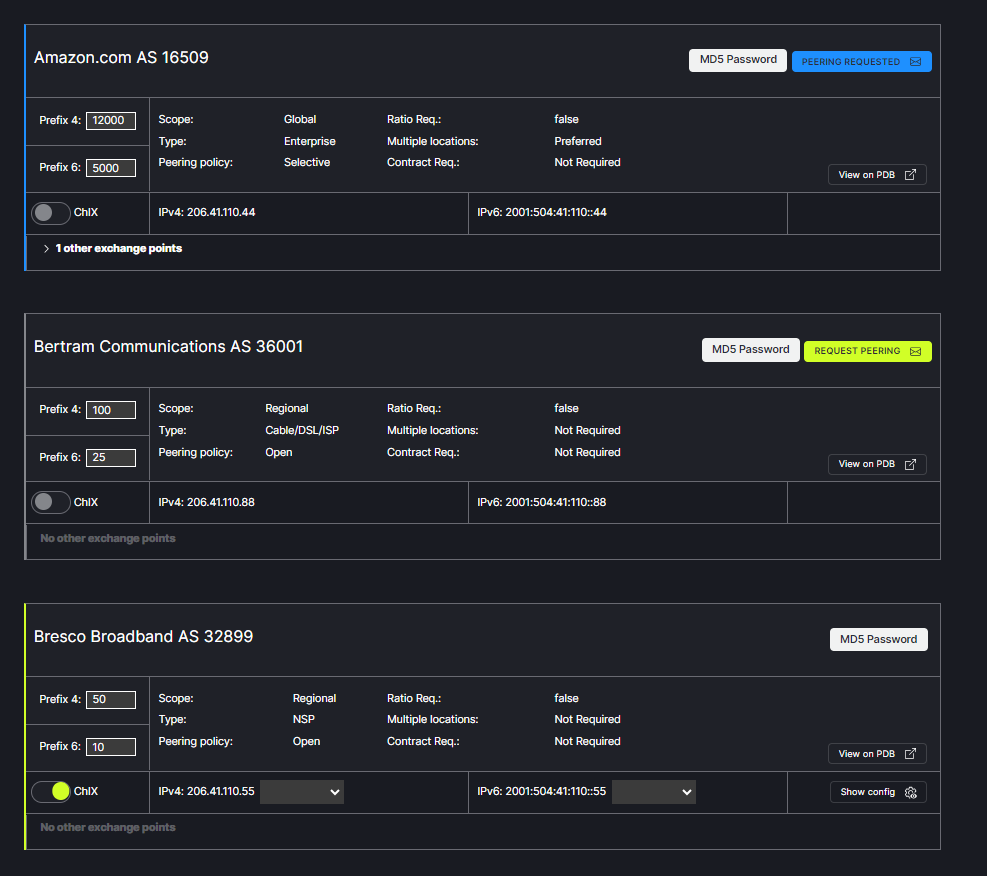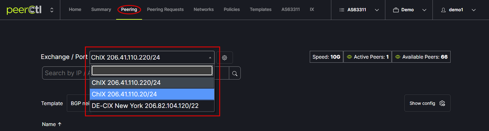 From the Peering tab in the header menu, Choose the Exchange/Port to be viewed from the drop down box at the top of the window. The data displayed is populated from PeeringDB.