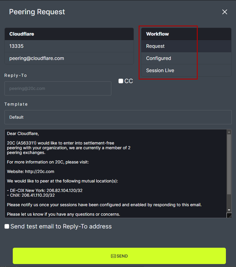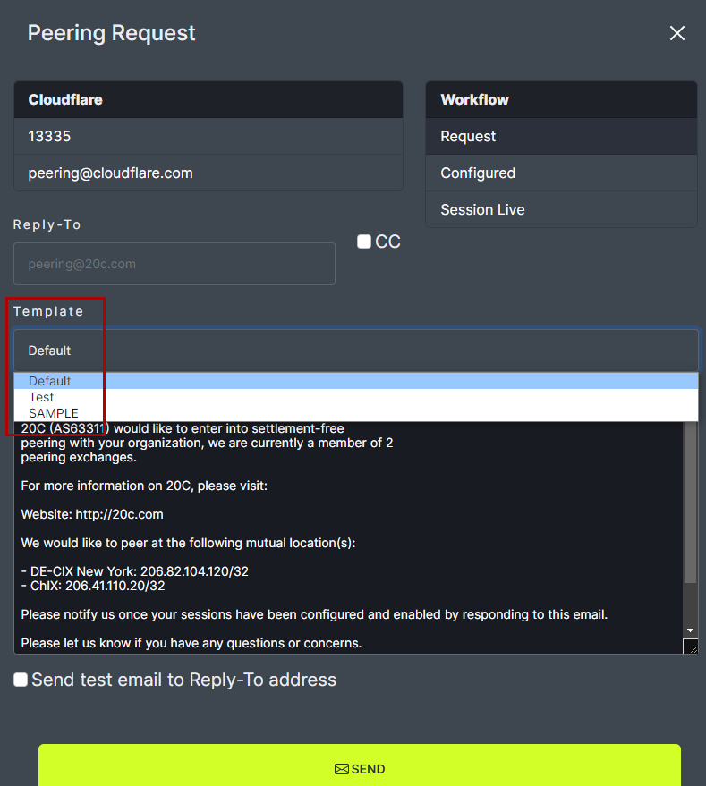 For each step of the Request Peering process, an email is sent to the network of interest. The default email option can be used or a custom email can be created. The default email appears in the Request Peering popup box. Custom email Templates will appear in the drop down menu.