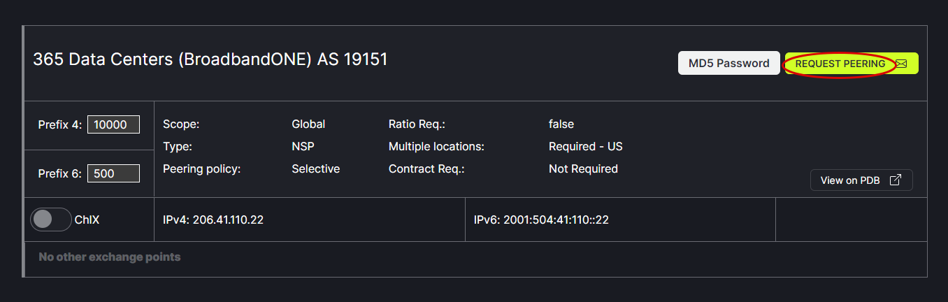 Note: When a peering request is made it includes all the shared exchange points. The shared exchange points can be viewed by clicking the arrow next to Shared Exchange Points.