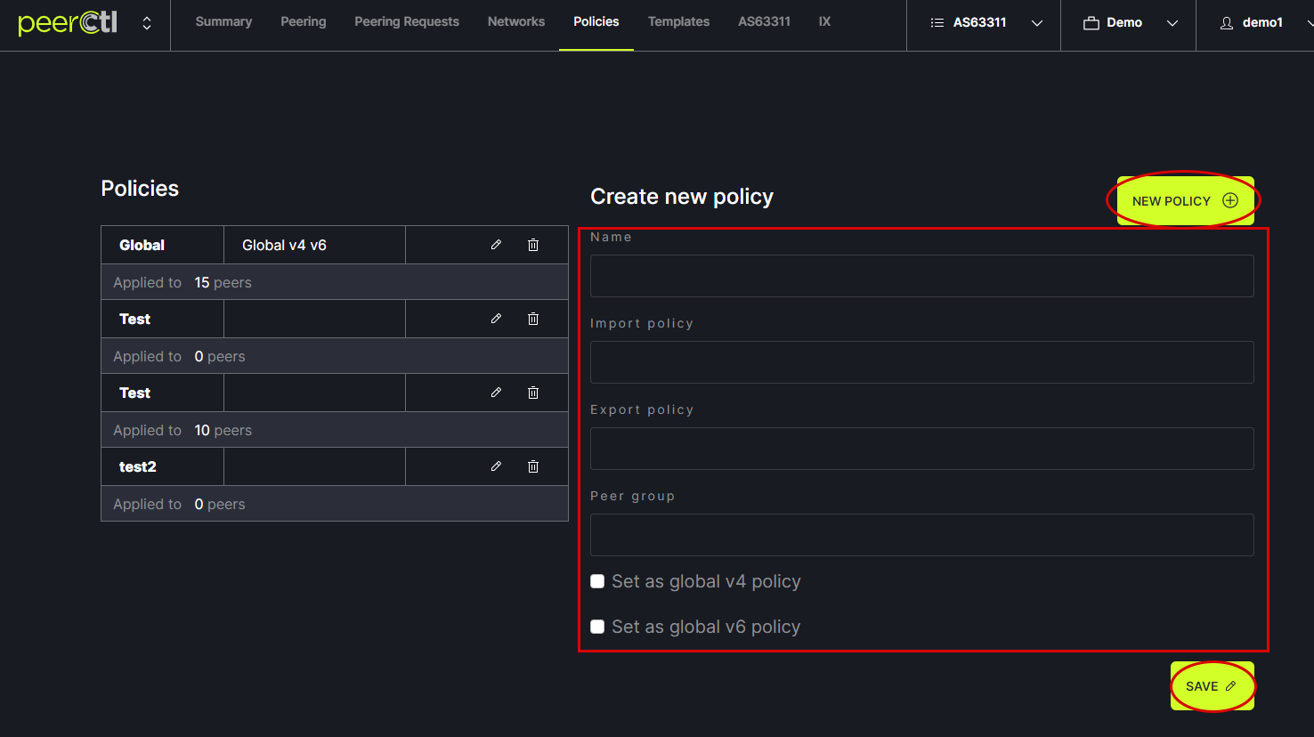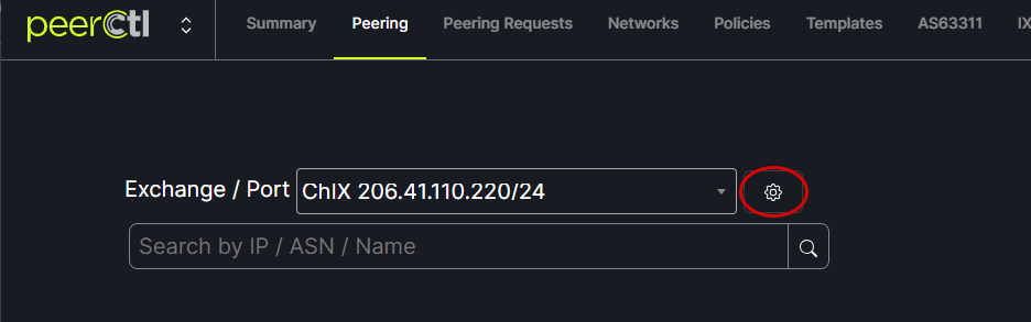 Setting the Policy allows users to set the default router configuration at a given network. There are two default options for setting the Policy: Global or Inherit Policy. Custom policies can also be created. The option chosen will be the default for all connections at this port. To choose a policy, click on the gear icon next to the Exchange/Port.