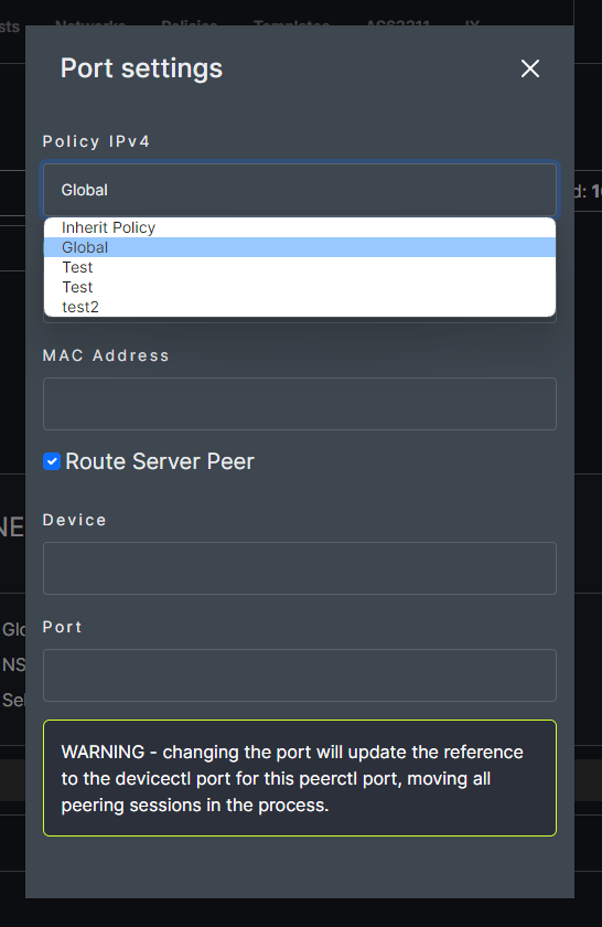In the Port settings popup, choose the desired Policy and Device type settings and close the popup.