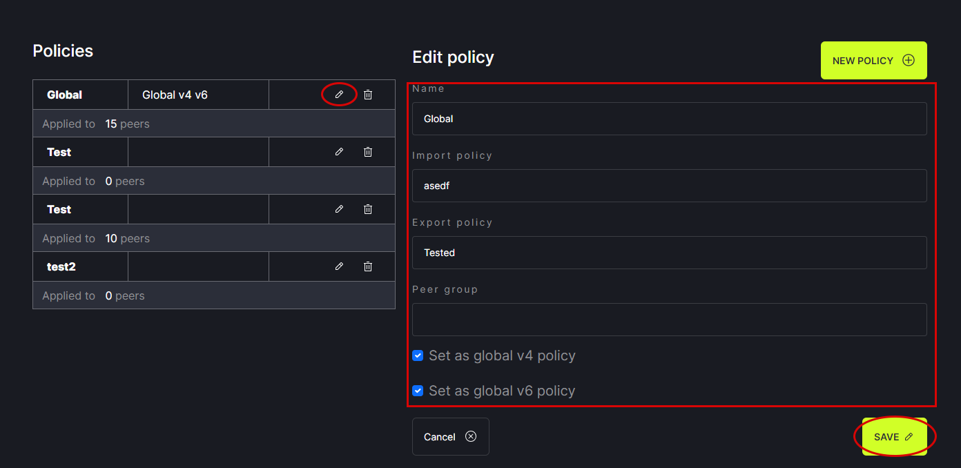 To modify the Global Policy, click on the pencil, enter the desired information, click Save.