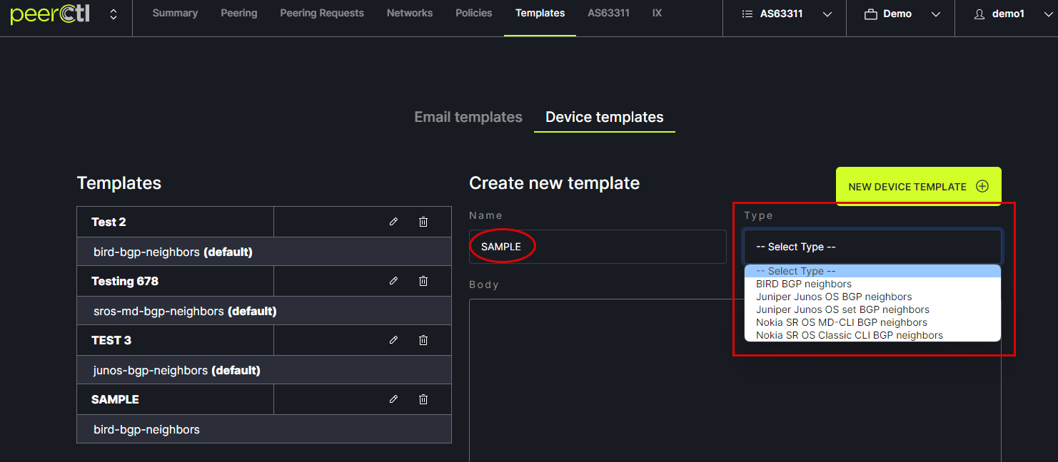 Add a new Template by entering a Name, choosing the Type from the drop-down menu, editing the text in the Body and clicking Save. Note: The templates available for configuration generation are dictated by the device type specified in deviceCtl. Currently the default device type in deviceCtl is set to junos. Templates for other device types can be created but will not appear in configuration generation unless the associated device type is specified in deviceCtl.