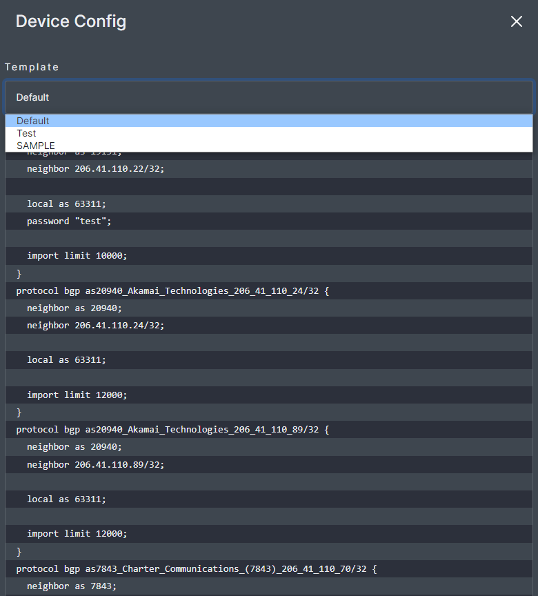 device.type- device typepeer_groups- adictionaryof peers with group name as keypeer.peer_as- ASN of the peerpeer.name- Name of the peerpeer.neighbor_address- ip address of neighborpeer.local_as- local asnpeer.auth_password- md5peer.max_prefixes- max number of prefixespeer.import_policy- import policypeer.export_policy- export policy