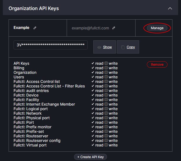 Clicking on the Manage button allows Users to set read/write permissions and view the API key.
