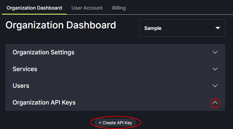 Organizational API Keys can be added to an Organizational account. From the Organization Dashboard tab, click the drop arrow on the right side of the API Keys field to display the Create API Key button.