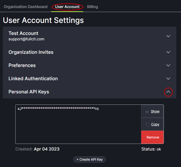 Personal API Keys can be added to a User account. From the User Account tab, click the drop arrow on the right side of the Personal API Keys field to display the API Key information.