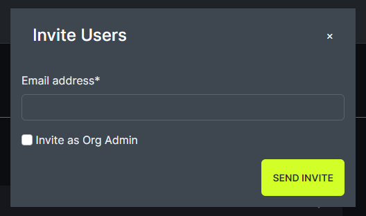 In the pop-up box, enter the email address of the person you are inviting. If you click the box for Invite as Org Admin the User will enter with Amin-level read/write permissions. Click on Send Invite.