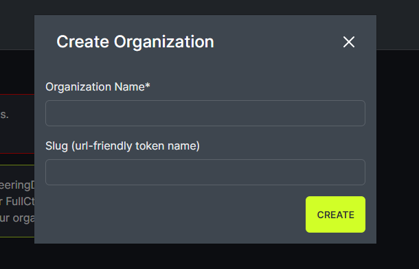You will be prompted to Create an Organization. Enter the Organization name and slug. Click Create. This can serve as your personal Organization or can be your business/work-related Organization. You can be affiliated with multiple Organizations. If you want to be affiliated with an Organization that already exists on FullCtl, you must be invited by the Admin of that Organization.