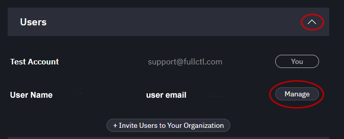 To assign User privileges, click on the Manage button next to the User’s name.