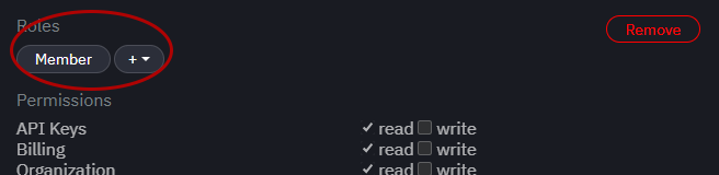 The roles can be customized using the checkboxes. The Remove button provides the option of removing the User from the Organization.