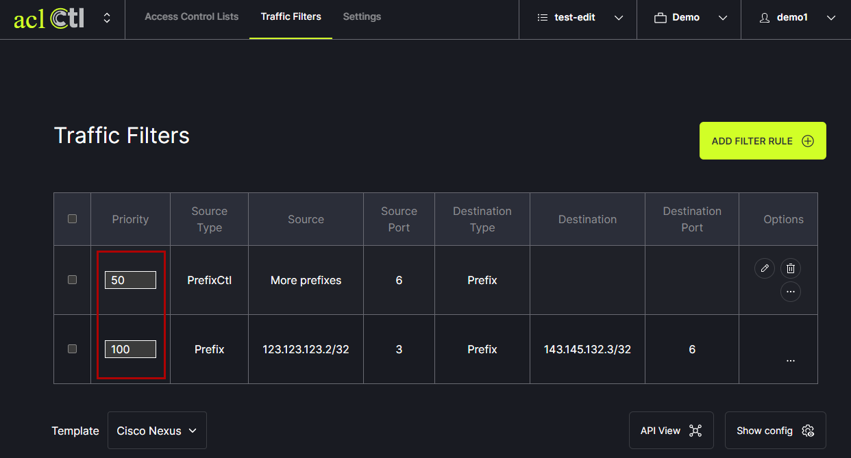 aclCtl progresses through the filter rules in the order they are listed. By default, filter rules are listed from lowest priority to highest priority. New filter rules are added to the bottom of the list. The priority can be set by changing the numbers in the Priority box. To change the priority of a filter rule, type a number into the box and hit enter. The list will automatically update to reflect the change in priority order.