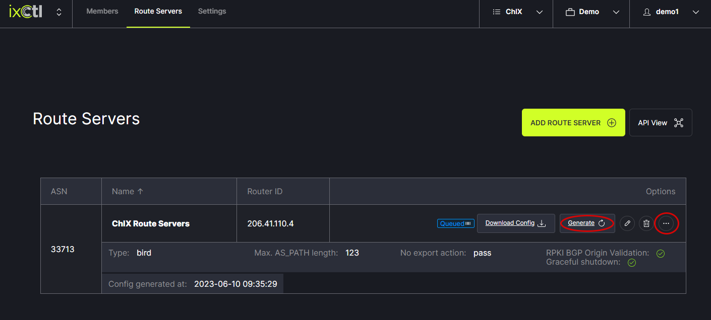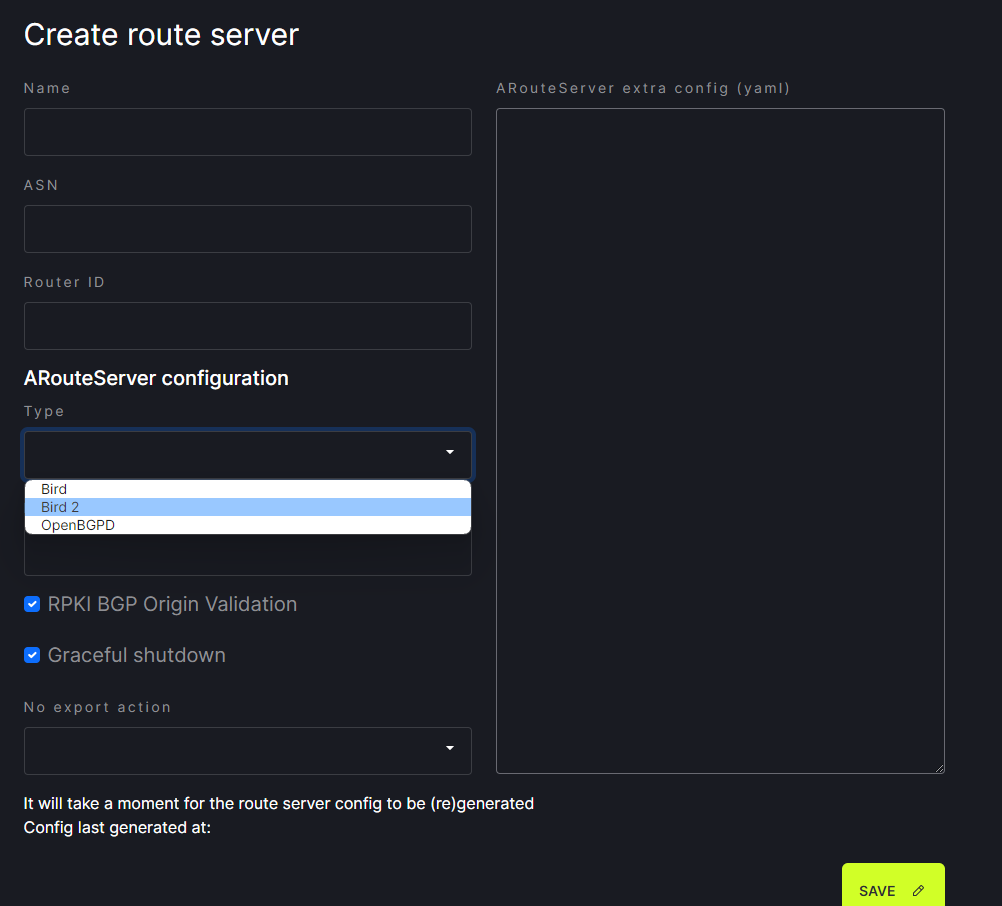 Enter the route server information and click Save. Note: There is an option to choose Bird or Bird 2 from the ARouteSever configuration drop down menu.