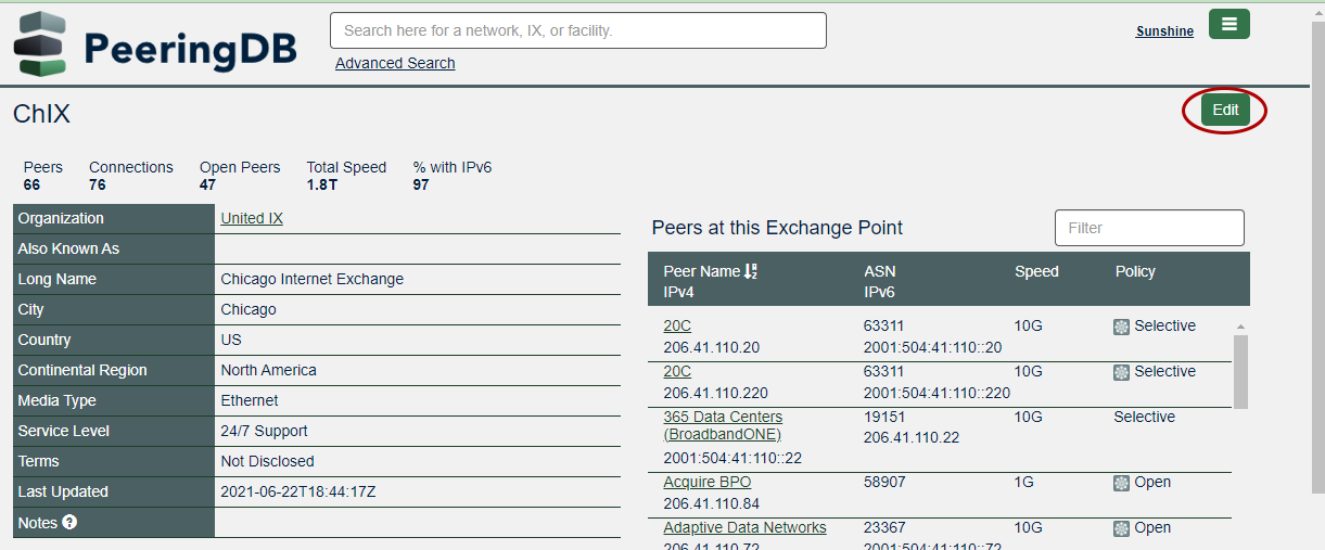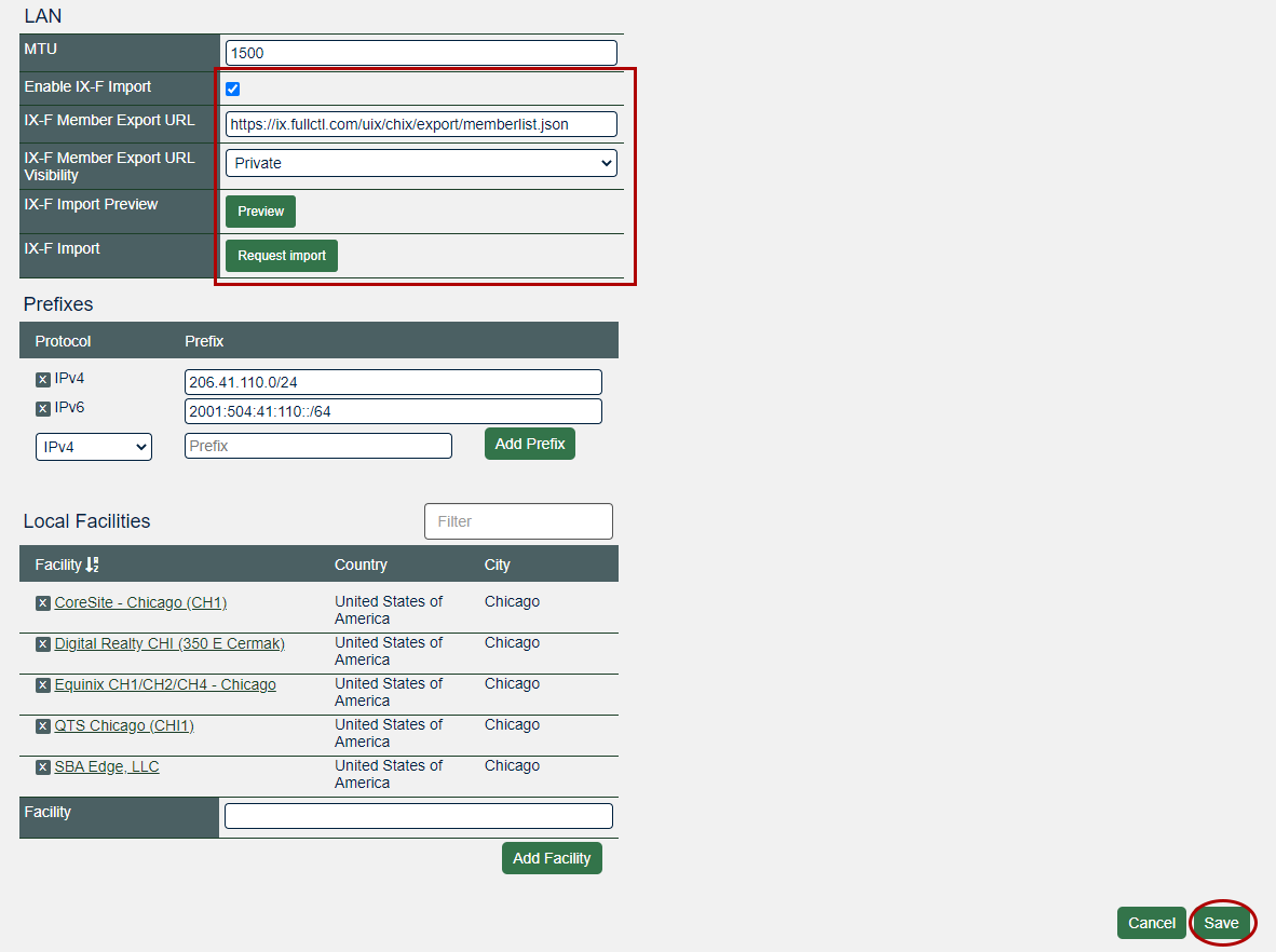 Under LAN, check the box next to Enable IX-F Import. In the box for IX-F Member Export URL, paste the link you copied from the IXCtl website. Click Preview to request an import during the next update (midnight UTC) or click Request Import for an immediate import. Click save in the lower right corner of the page.