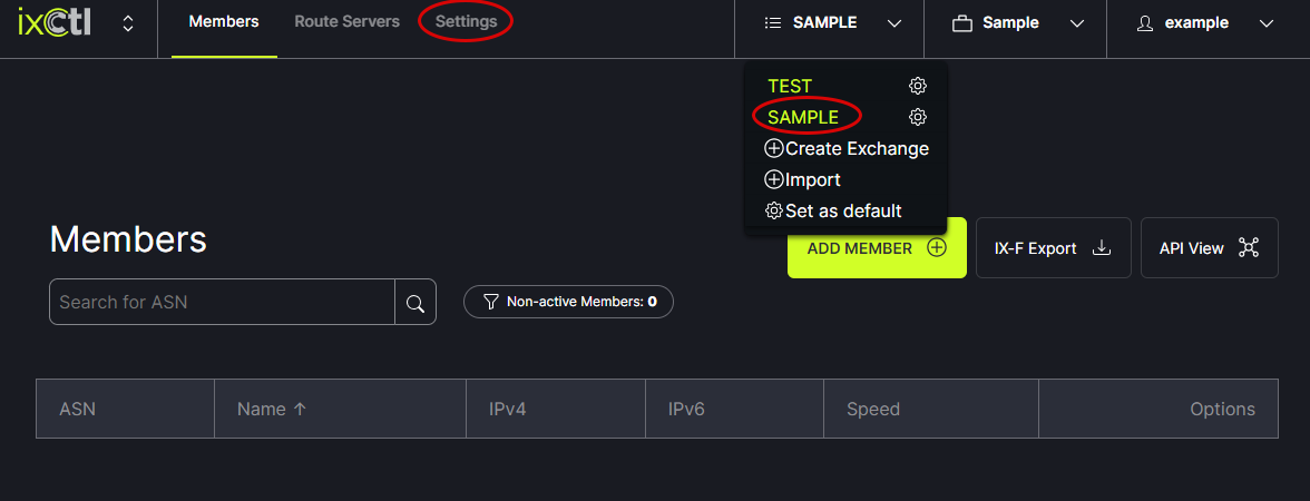 From the drop down menu in the header, choose the Exchange to be shared from. Then, click on the Settings tab in the header menu.