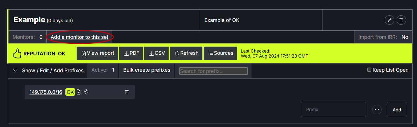 To add a reputation monitor to a prefix set, click Add a monitor to this set.