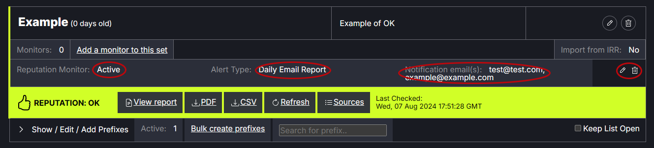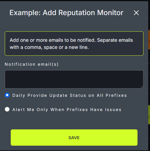 A Reputation Monitor can be added to each prefix set. The Reputation Monitor(s) will receive email notifications about reputation issues. When a Reputation Monitor is assigned, an automatic check will occur once per day.