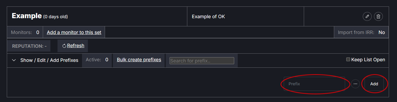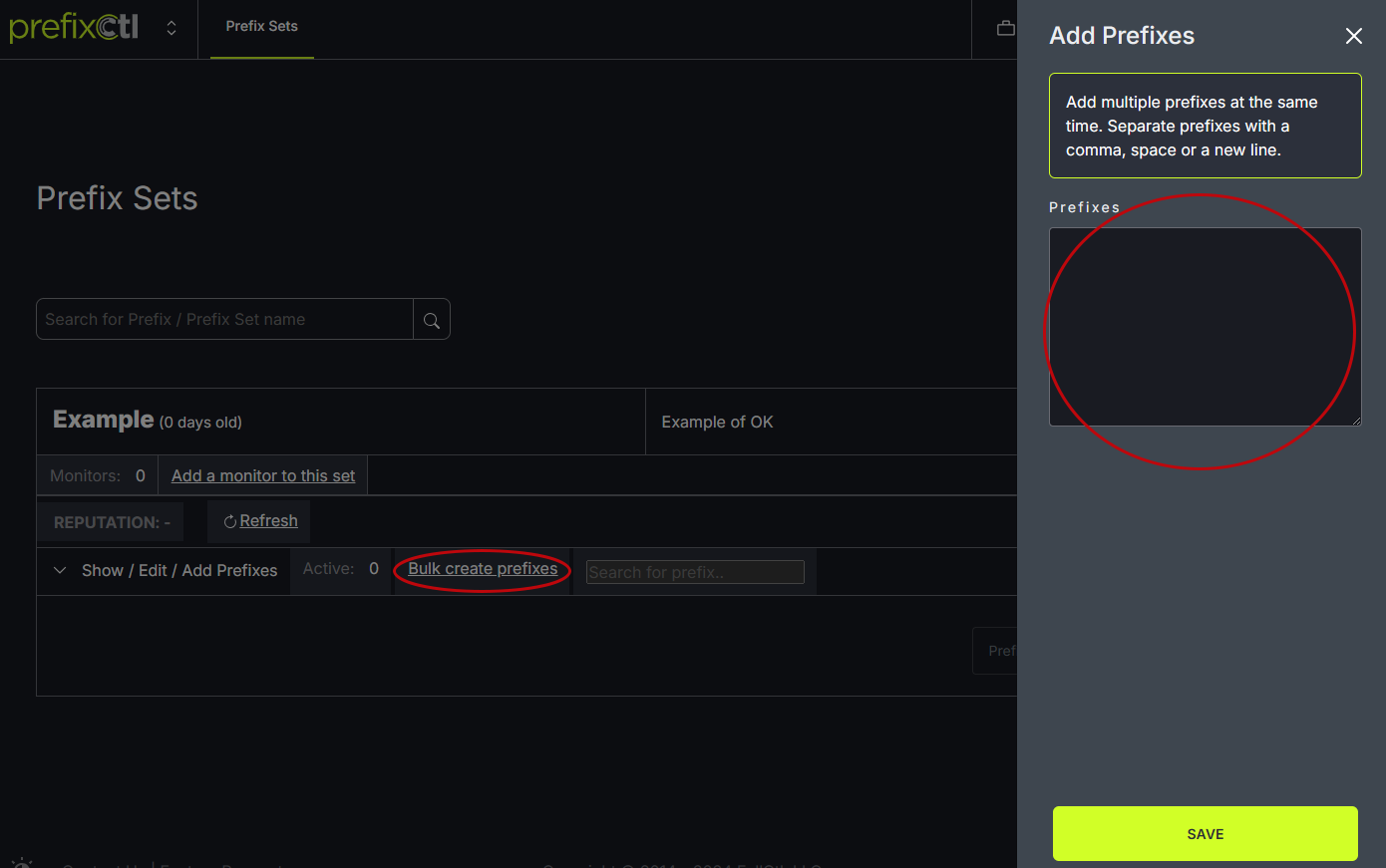 After a prefix set has been created, one or more prefixes can be added. To enter prefixes, either paste the prefix into the prefix field and click Add OR click on Bulk create prefixes and paste any number of prefixes then click Save. Note: The system may error if there are extra spaces before or after prefixes entered.