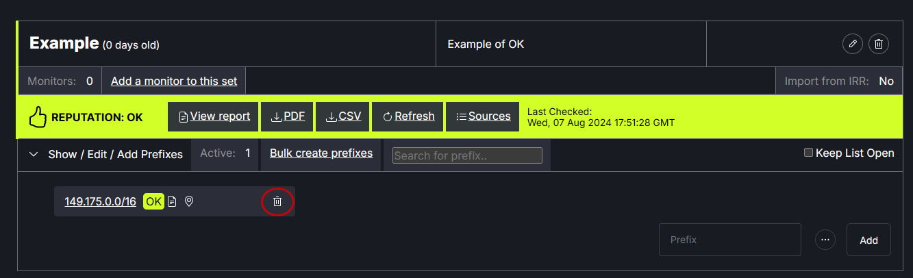 Prefixes can be removed from a prefix set using the trash can icon next to a prefix.